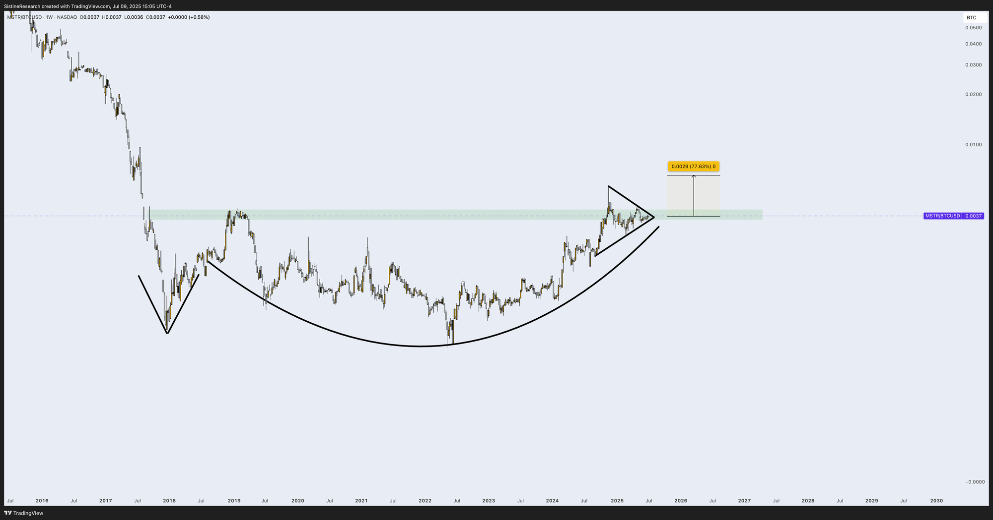 MSTR vs BTC is in a large adam and eve bottoming pattern in addition to a triangle at the top of a 7 year range.